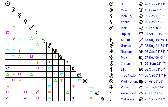 Sun | 28 Cancer 24 | 29 Cancer 11 | 4 Virgo 51 |