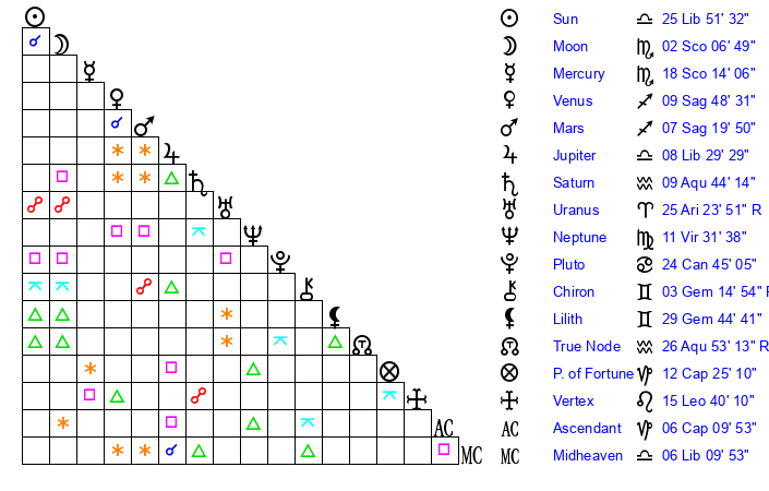 | Sun | 25 Libra 51 | 26 Libra 34 | 28 Capricorn 57 |