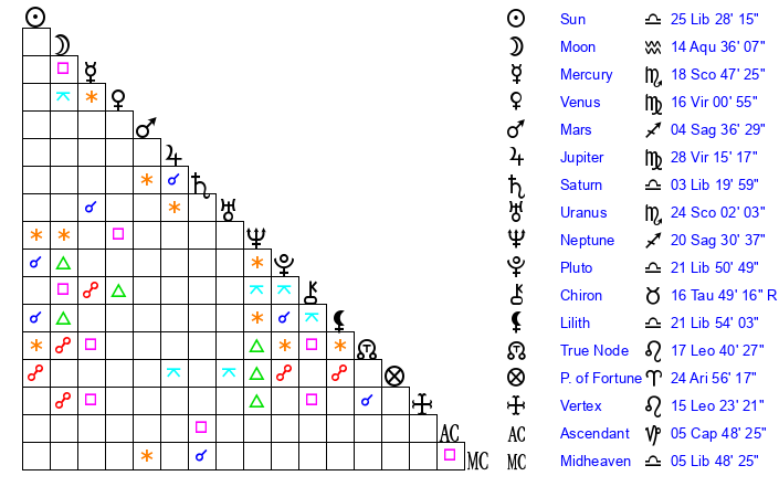 | Moon | 14 Aquarius 38 | 24 Virgo 15 | 16 Libra 38 |
