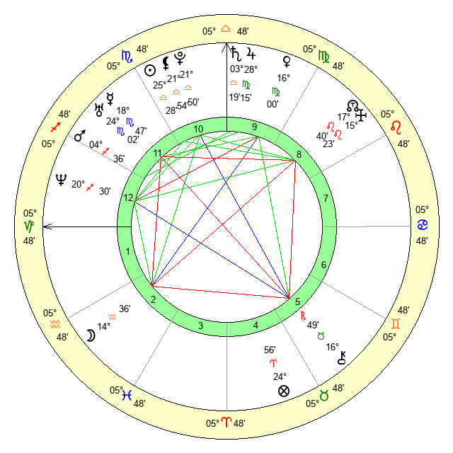 | Venus | 16 Virgo 1 | 5 Libra 59 | 10 Scorpio 41 |