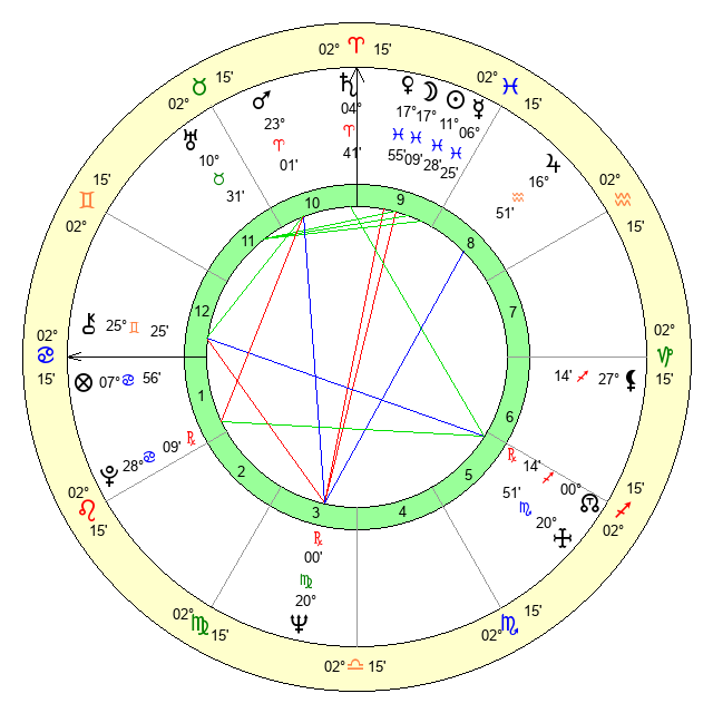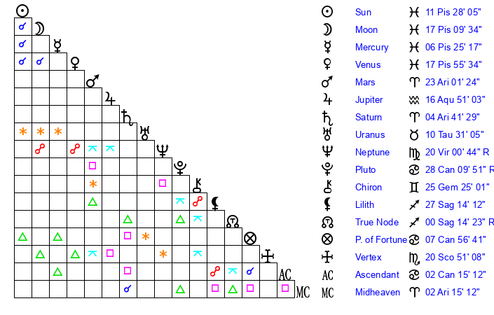 | Sun | 11 Pisces 28 | 12 Pisces 22 | 6 Gemini 41 |