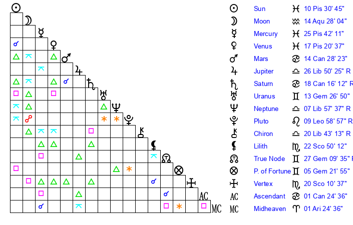 | Neptune | 7 Libra 58 | 28 Pisces 55 | 6 Libra 3 |