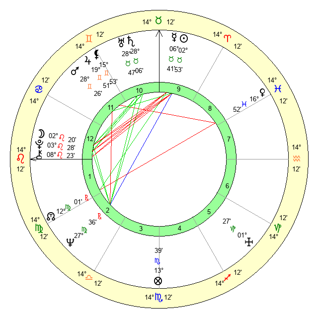 | Moon | 2 Leo 14 | 6 Pisces 54 | 17 Leo 14 |