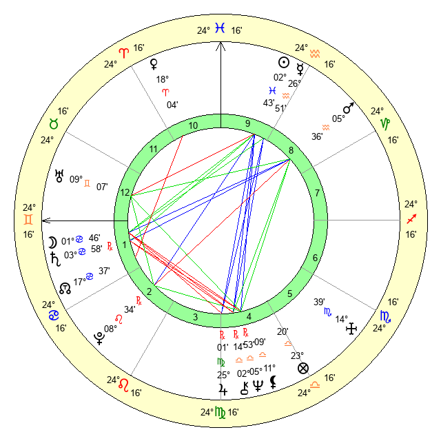 | Moon | 1 Cancer 48 | 14 Sagittarius 3 | 3 Gemini 34 |
