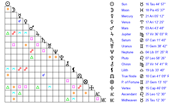 | Sun | 16 Taurus 45 | 17 Taurus 23 | 3 Leo 19 |