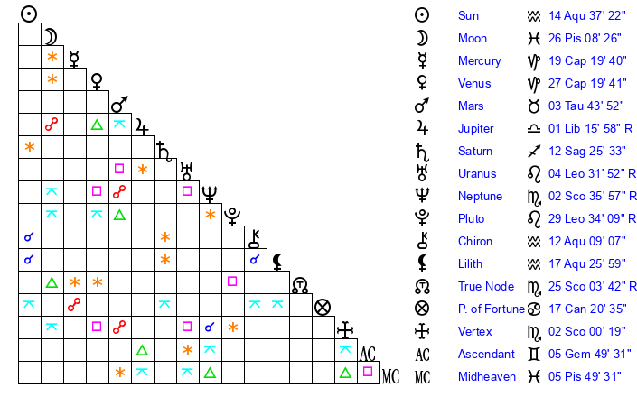| Sun | 14 Aquarius 37 | 15 Aquarius 7 | 22 Aries 31 |