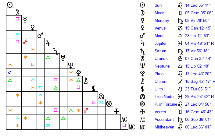 | Sun | 14 Leo 36 | 15 Leo 26 | 27 Libra 44 |