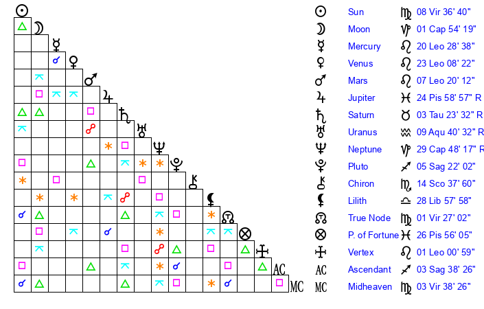 Venus | 23 Leo 8 | 7 Leo 51 | 26 Virgo 37 |