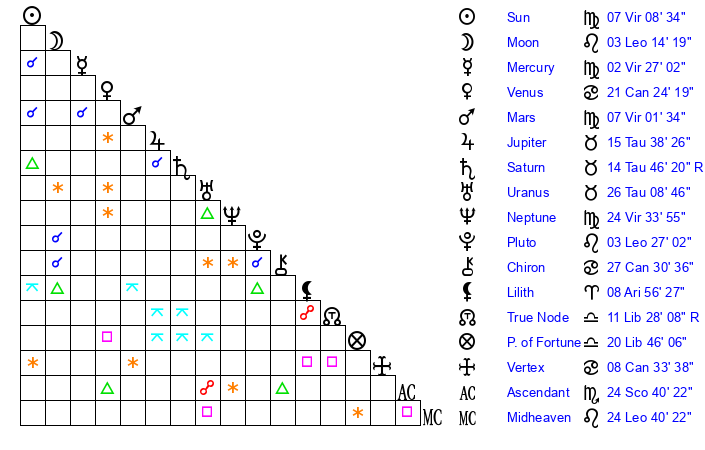 | Moon | 3 Leo 8 | 1 Sagittarius 28 | 14 Virgo 23 |
