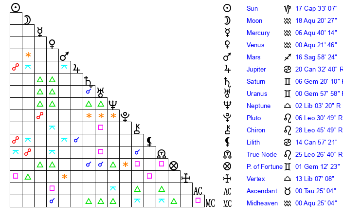 | Moon | 18 Aquarius 11 | 11 Taurus 11 | 14 Aquarius 58 |