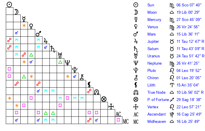 | Moon | 19 Libra 3 | 6 Aquarius 51 | 2 Sagittarius 13 |