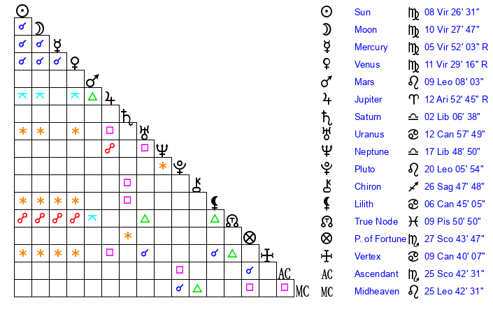 | Moon | 10 Virgo 36 | 25 Sagittarius 29 | 3 Gemini 26 |