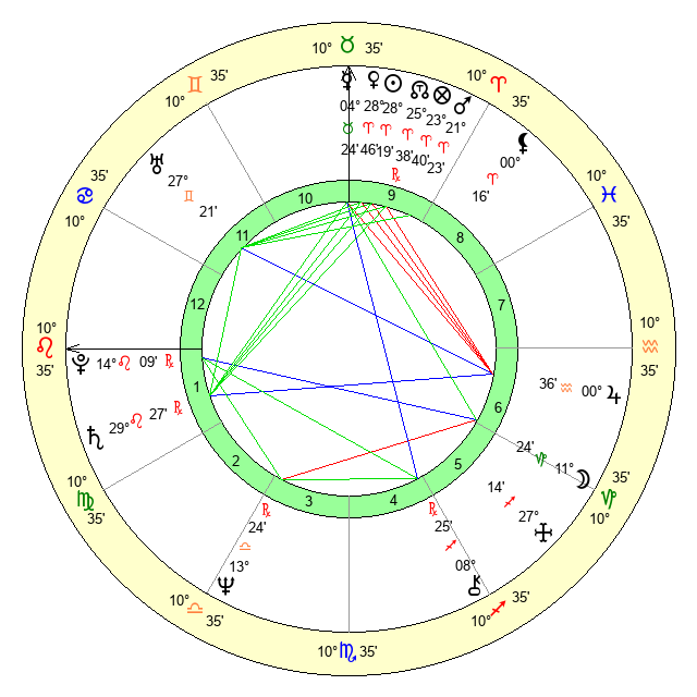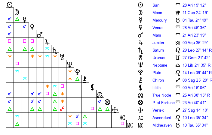 | Venus | 28 Aries 47 | 25 Pisces 15 | 2 Leo 6 |