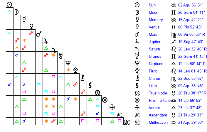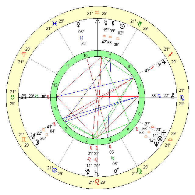 | Moon | 26 Gemini 14 | 24 Scorpio 1 | 21 Aries 38 |