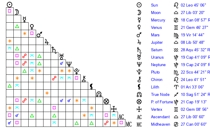 | Moon | 27 Libra 4 | 14 Leo 26 | 1 Capricorn 37 |