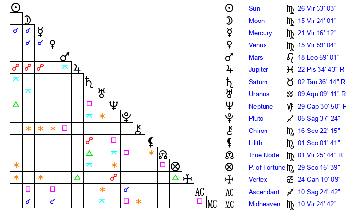 | Moon | 15 Virgo 16 | 2 Virgo 17 | 12 Virgo 22 |