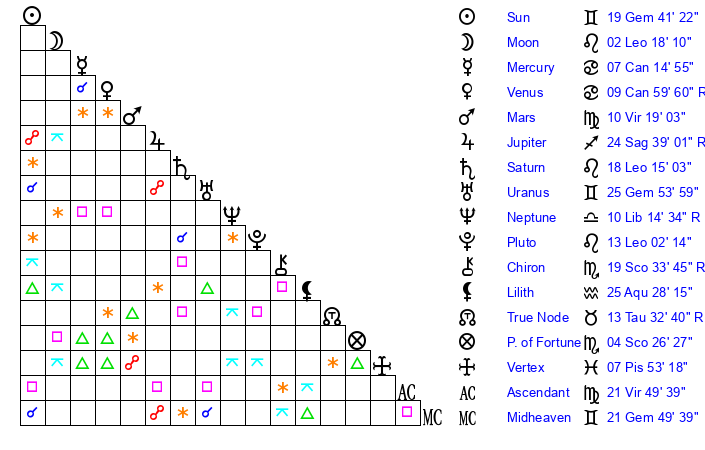 | Sun | 19 Gemini 41 | 20 Gemini 4 | 3 Virgo 20 |