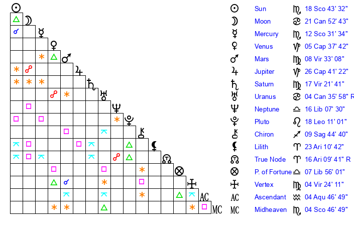 | Sun | 18 Scorpio 44 | 19 Scorpio 18 | 5 Aquarius 56 |