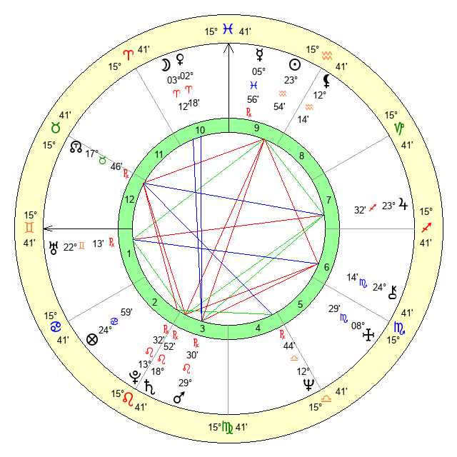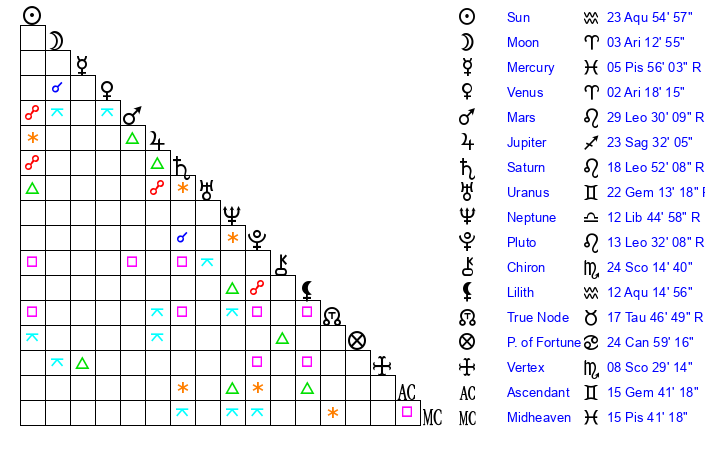 | Moon | 3 Aries 16 | 8 Virgo 8 | 4 Aquarius 46 |