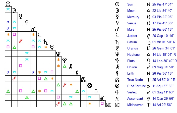 | Neptune | 14 Libra 17 | 29 Pisces 28 | 12 Libra 31 |