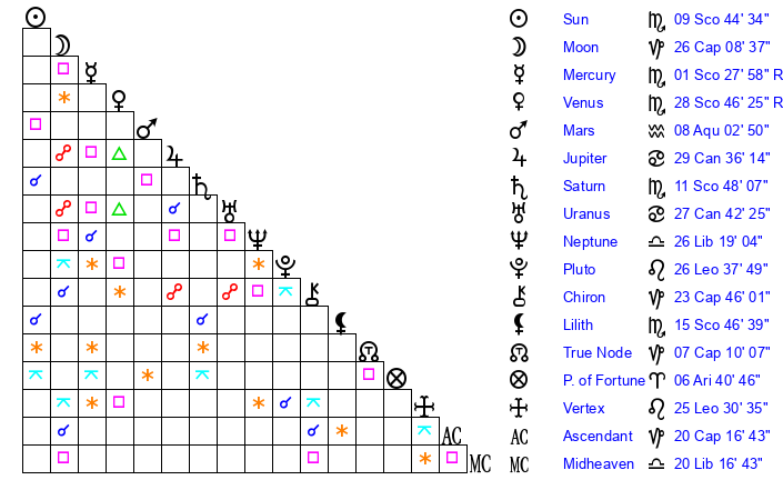 | Sun | 9 Scorpio 44 | 10 Scorpio 31 | 21 Capricorn 43 |