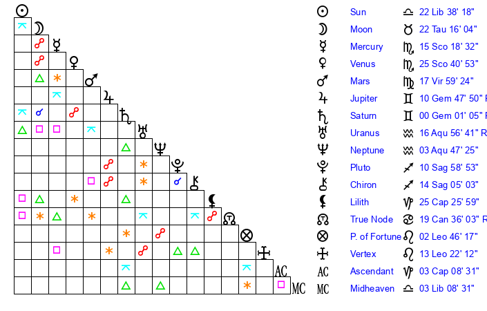 | Neptune | 3 Aquarius 46 | 0 Aries 9 | 3 Aquarius 57 |