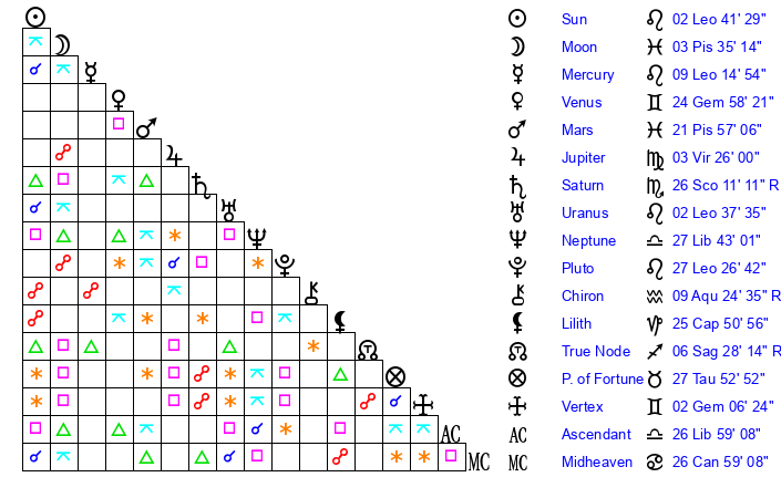 | Moon | 3 Pisces 38 | 14 Leo 26 | 19 Virgo 43 |