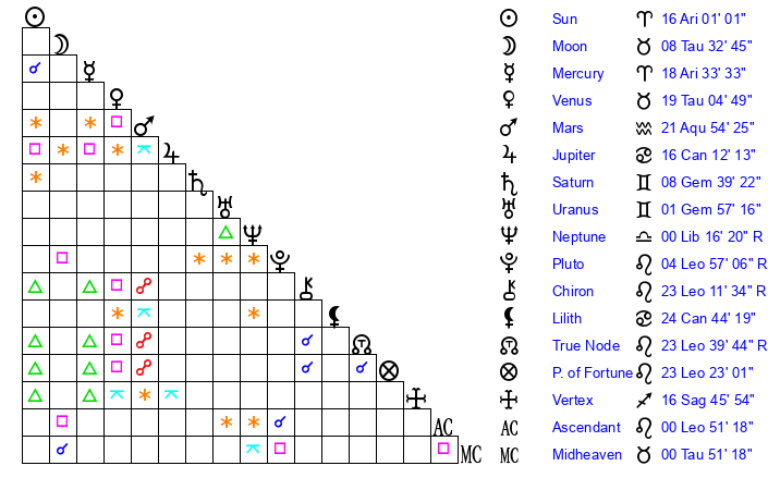 | Moon | 8 Taurus 32 | 6 Leo 44 | 10 Taurus 13 |