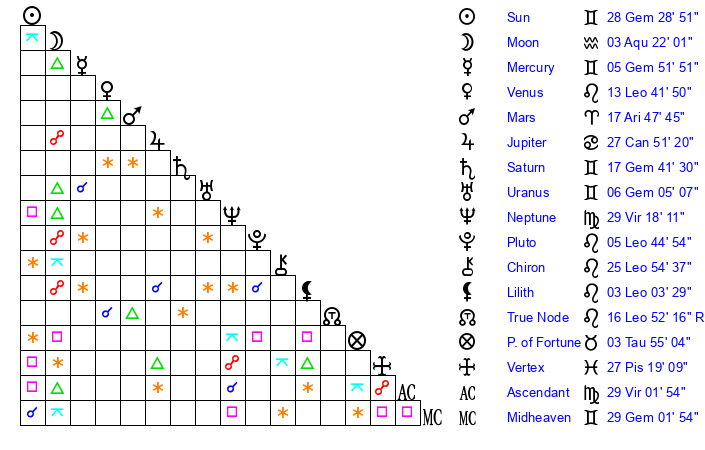 | Sun | 28 Gemini 29 | 29 Gemini 37 | 17 Virgo 6 |