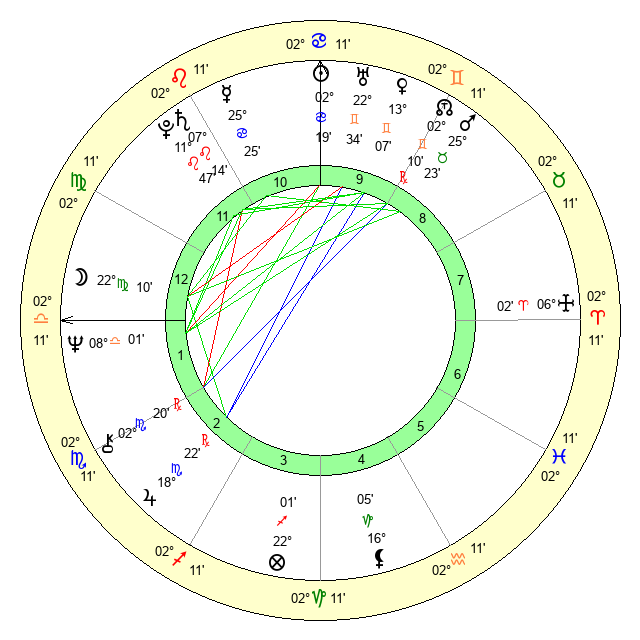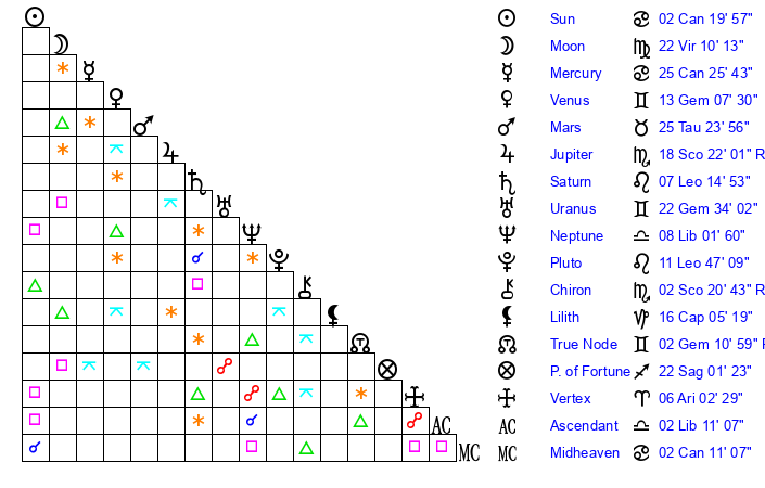 | Moon | 22 Virgo 19 | 23 Gemini 25 | 20 Cancer 47 |
