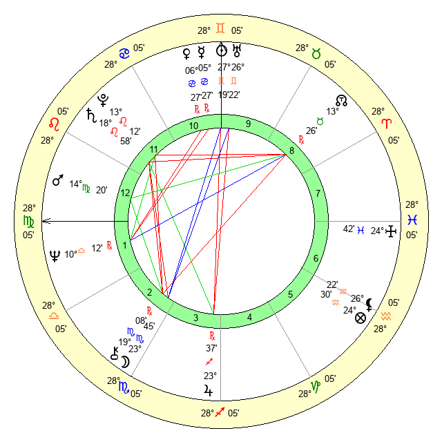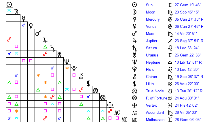 | Sun | 27 Gemini 20 | 27 Gemini 42 | 11 Virgo 5 |