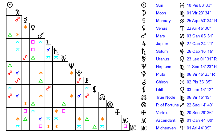 | Moon | 1 Virgo 26 | 4 Aries 18 | 4 Capricorn 55 |