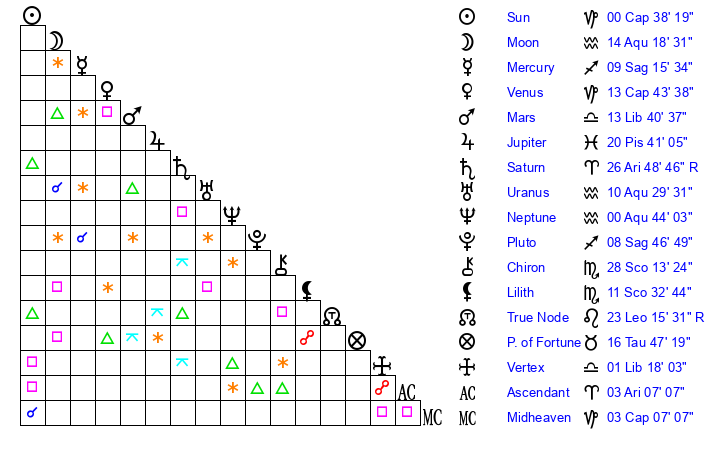 | Sun | 0 Capricorn 39 | 1 Capricorn 6 | 28 Capricorn 9 |