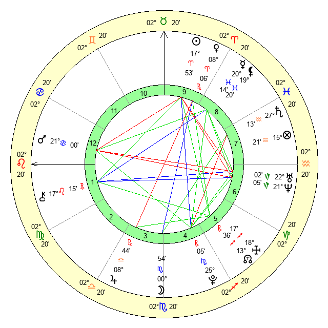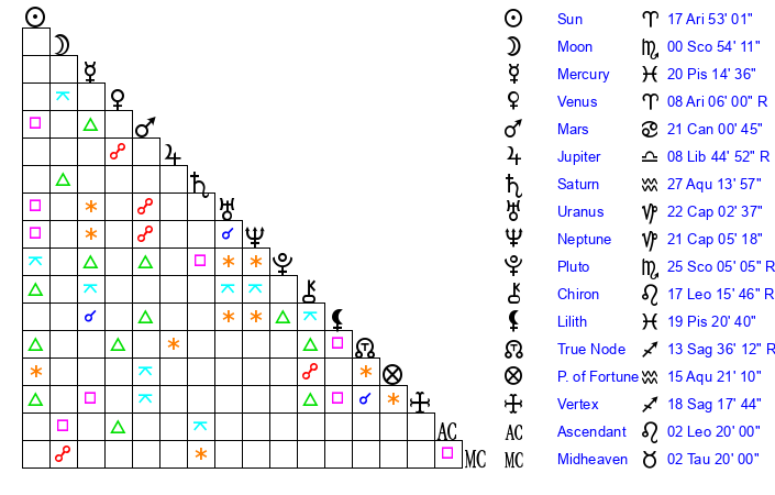 | Moon | 0 Scorpio 54 | 19 Leo 20 | 5 Capricorn 1 |