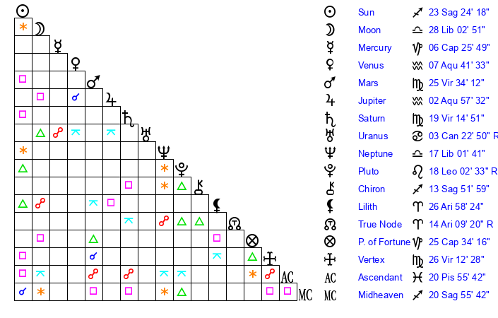 | Saturn | 19 Virgo 45 | 25 Pisces 20 | 17 Virgo 3 |