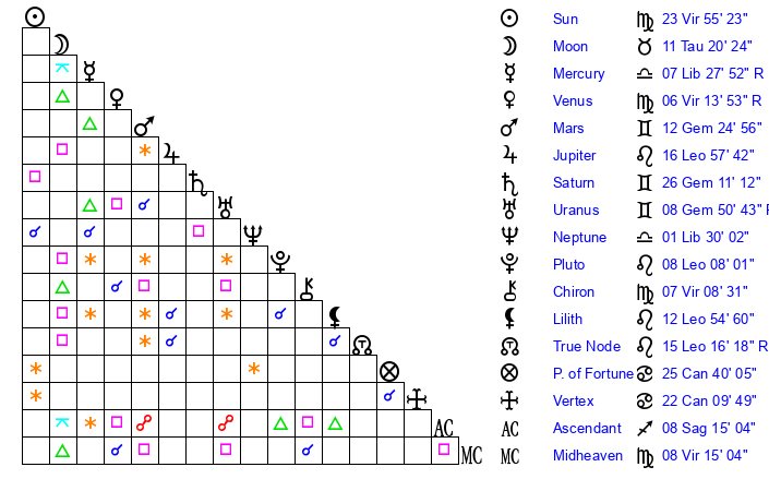 | Sun | 23 Virgo 55 | 25 Virgo 3 | 15 Sagittarius 44 |
