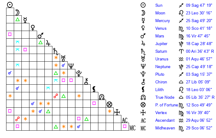 | Venus | 10 Scorpio 41 | 1 Sagittarius 5 | 16 Sagittarius 50 |