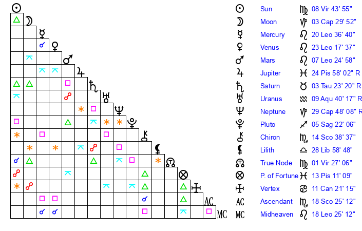 | Mars | 7 Leo 25 | 16 Libra 10 | 24 Leo 22 |