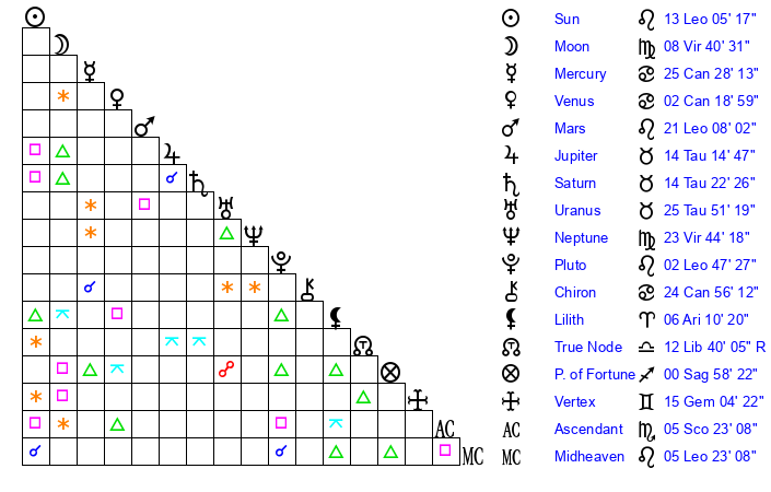 | Sun | 13 Leo 5 | 13 Leo 31 | 6 Scorpio 8 |