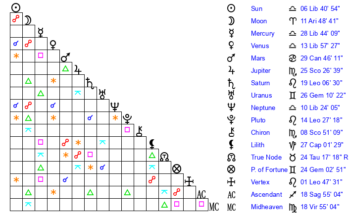 | Neptune | 10 Libra 24 | 0 Aries 32 | 12 Libra 46 |