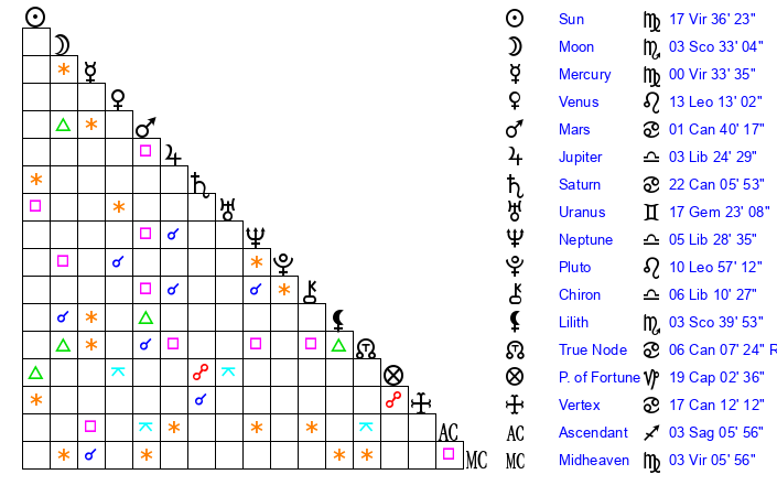 | Sun | 17 Virgo 36 | 18 Virgo 14 | 7 Sagittarius 8 |
