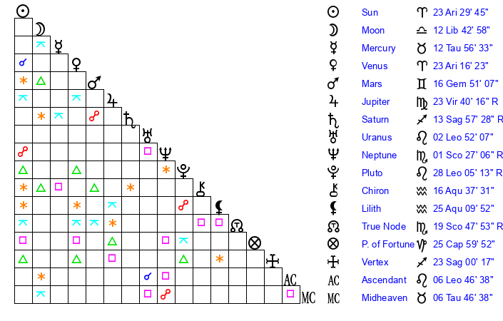 | Venus | 23 Aries 16 | 24 Pisces 39 | 16 Cancer 54 |