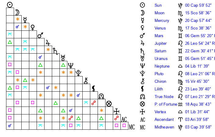 | Moon | 15 Scorpio 55 | 13 Aquarius 6 | 16 Scorpio 28 |