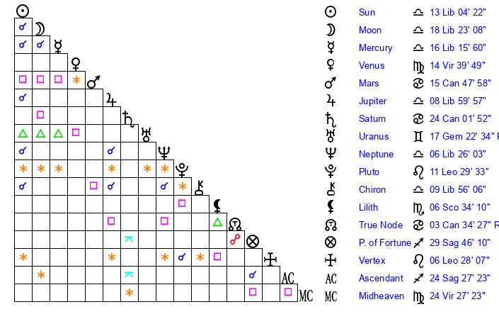 | Neptune | 6 Libra 27 | 0 Aries 23 | 8 Libra 33 |