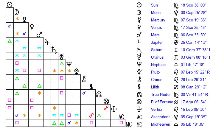 | Sun | 18 Scorpio 38 | 19 Scorpio 31 | 12 Aquarius 57 |