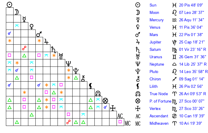 | Sun | 20 Pisces 48 | 21 Pisces 22 | 5 Gemini 6 |