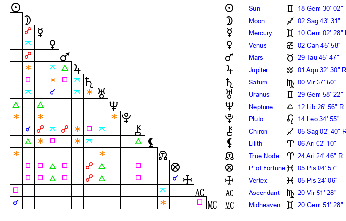 | Sun | 18 Gemini 30 | 19 Gemini 6 | 1 Virgo 10 |