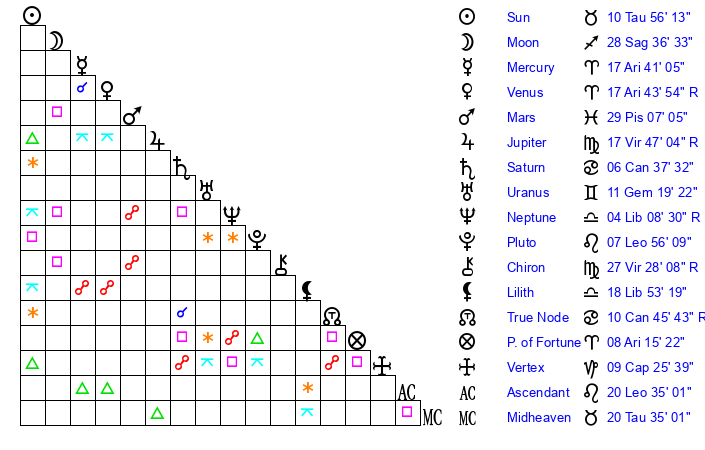 | Pluto | 7 Leo 55 | 3 Aquarius 48 | 9 Leo 29 |