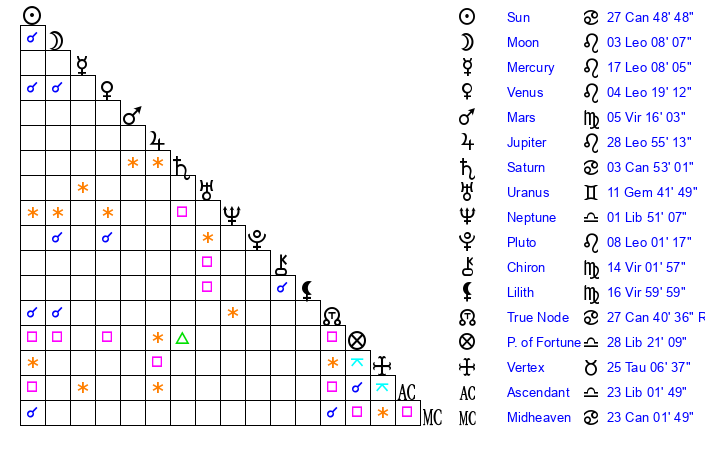 | Moon | 3 Leo 0 | 3 Gemini 54 | 23 Cancer 53 |
