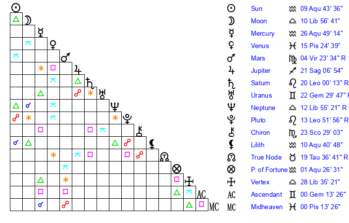 | Moon | 10 Libra 48 | 26 Aquarius 25 | 25 Cancer 14 |